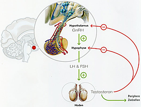 Wie bei vielen Hormonen ist Testosteron kein «Selbstläufer». Man muss sich das als Regelkreis vorstellen. Die Produktion wird durch das Gehirn (Hypothalamus und Hypophyse) über andere Hormone gesteuert: Es wird die Ausschüttung von GnRH, einem «Auslöse» – Hormon initiiert, welches die Ausschüttung von zwei anderen Hormonen, dem FSH und dem LH, auslöst. Diese wiederum setzen u.a. die Testosteronproduktion in Gang. Die aktive bzw. im Körper zirkulierende Menge an Testosteron wird durch das im Hypothalamus gebildete und durch die Hypophyse an den Blutkreislauf abgegebene GnRH reguliert. Dies indirekt, durch die vermehrte oder gedrosselte Ausschüttung von FSH und LH (aus der Hypophyse).